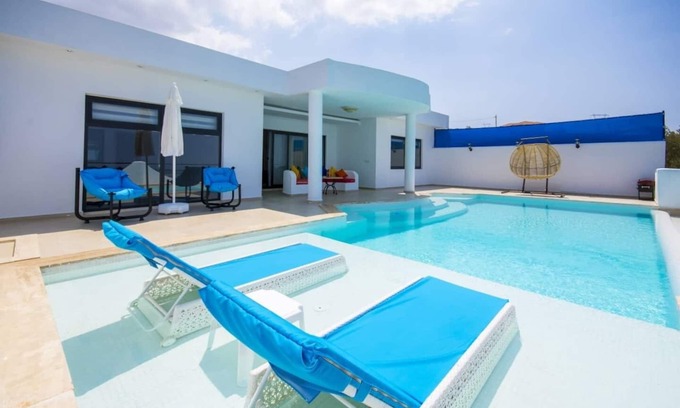 Our villa with authentic Mediterranean architecture has a private step-entrance swimming pool and a shallow pool. You can enjoy the sun loungers in the shallow pool. There is also a shower, a swing, a sitting group consisting of two single seats and an authentic stone sitting group in the shape of a crescent.