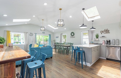 Comfy house to accommodate large groups for a time away from it all. Open spacious living room with private bar, office station and large kitchen. Great for entertaining. Wake up to beautiful views of the lake.