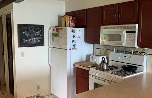 Main floor bedroom with king bed and three bedrooms on the second floor. Walk-out basement rec room with lots of seating for watching movies, playing games, and puzzles for rainy days. Full kitchen with dishwasher. First floor full size washer and dryer.