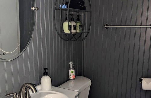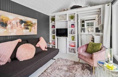 One bathroom, one queen-sized bed and a futon complete this vacation studio tiny home.