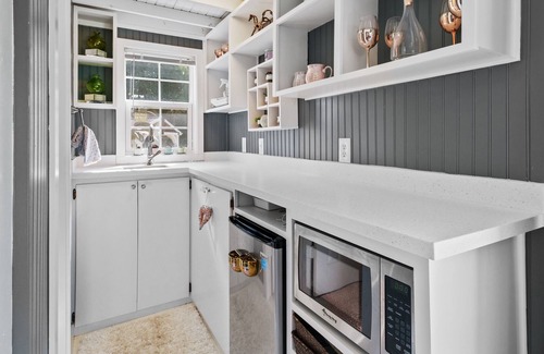 Main house has a full size kitchen, 2 fireplaces (One is gas and one is wood-burning), and an Italian Bertazzoni induction range/stove.