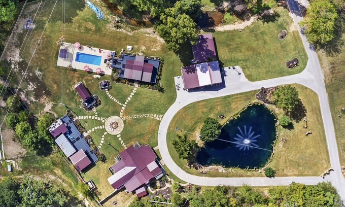 The 6 acre property has a creek, a natural spring, a stocked pond with a fountain, outdoor pool, hot tub, outdoor firepit, an outdoor kitchen with a built in pizza oven, and a screened-in pavilion.