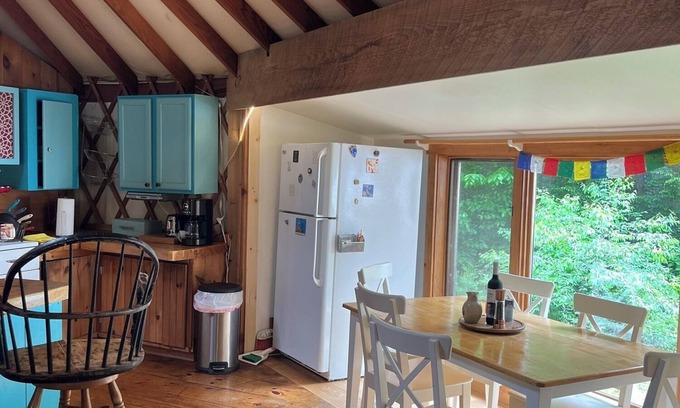 Private yurt complex near town. Feel refreshed when you stay in this rustic gem. This is a series of yurts joined together. One huge 30 foot yurt with a loft that sleeps two. A 16 foot yurt off a private wing, plus an addition. 7 minutes to downtown and saco river beach access. *Highly secluded*, You won't see your neighbors from this property. Free bottle of wine for every stay! Surround Yourself with Nature