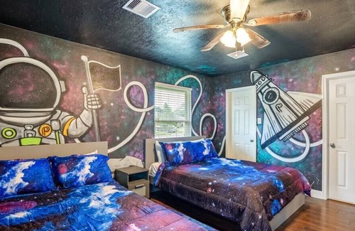 This Prolific Theme House is one of its kind! From the unique decor throughout this home, basketball court, and spacious backyard, you can never get bored! Whether you want to shoot content, have fun or visit your favorite attractions in Houston, you canβt go wrong with this Prolific Themed Home! Less than two minutes from I-610 a major highway and 15 minutes from all of the biggest attractions Houston has to offer, this house is an experience you donβt want to miss!