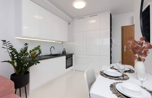 This fashionable apartment offers accommodation for 2 people. The living area consists of a stylish living room with a kitchenette, a bedroom with a double bed and a bathroom with a shower. The apartment includes a balcony equipped with garden furniture, which is a perfect place to relax with a cup of coffee in hand after a long day of sightseeing in the Capital. Tasteful furnishings and fashionable accessories contribute to the amazing atmosphere of the apartment. Functionality, aesthetics and a harmonious color palette make this place delight even the most demanding guests. Multimedia equipment includes two TVs with SmartTv technology and access to high-speed, free WiFi connection. The apartment is stocked with all the basics necessary for relaxation. A complimentary set of toiletries (soap, shampoo and shower gel), towels and linens are provided to facilitate the start of each stay. In addition, this place offers a private parking space in an outdoor parking lot.