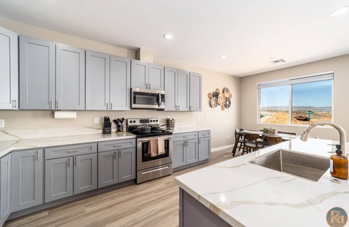 Adventure awaits at Pueblo en Powell! Brand new construction home centrally located in the Grand Circle with many attractions just minutes away, this home is the perfect spot for your desert retreat. Views for miles of the Utah Arizona rock formations and Lake Powell can be enjoyed from the hot tub, patio lounge, game room and many rooms in the house.