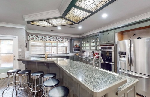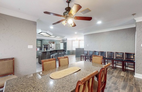 If wide open spaces, upscale furnishings, and a sparkling pool are on your list for the perfect vacation destination, look no further. This beautiful home on seven acres of quiet property is the prime place to kick back and relax away from the humdrum of everyday life. inside the spacious and luxurious abode, you'll be met with a bright interior and a cozy atmosphere throughout the well-appointed living area. Marvel at the attention to detail, the modern and contemporary decor, and the blanket of natural light that make this home a joy to live in. This home has many spacious rooms for private conversations and well-deserved you-time. Curl up on the plush furniture with a good book by the fireplace, stream a movie marathon on the large TV, or hold great conversations in every warm and inviting gathering area. Challenge your loved ones to a rousing game of foosball in your downtime to win bragging rights. Prepare grand meals and touring snacks in the sophisticated open-concept kitchen, complete with state-of-the-art stainless steel appliances, a floating island breakfast bar that seats seven, and a formal dining table. Head upstairs to compete in a game of billiards and enjoy cocktails at the wet bar. Comfortable beds in spacious bedrooms ensure everyone receives a wonderful night's rest from the day's adventures. The main suite boasts space exquisite enough for royalty with a luxurious en suite bathroom with a jetted tub and over-sized walk-in shower. With two laundry spaces, you'll enjoy the convenience of taking clean clothes with you when it's time to return to normal life.