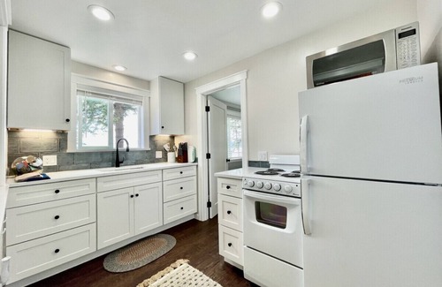 Inside, you’ll find a completely renovated space—every detail brand new, every amenity thoughtfully chosen. The fully stocked kitchen is ready for meals in or late-night snacks, and coffee lovers will appreciate the French Press, drip machine (with coffee packets), and Keurig—because how you start your day matters.