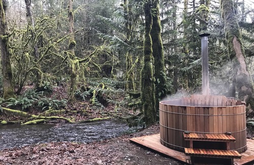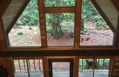 Enjoy this creekside A-Frame cabin situated on it s own private acre in the woods. Light a fire in the outdoor firepit or curl up next to the pellet stove inside. Take a soak in the wood fired cedar hot tub.