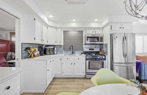 Step aboard Pura Vida and immerse yourself in the charm of a unique boat retreat. The boat boasts a very comfortable living room with boho/vintage/contemporary vibes, featuring a brand new queen sleeper sofa. Situated across from the living area, you'll find a dining area seating four, complete with a full kitchen boasting a four-burner gas range, full-size fridge/freezer, and new quartz countertops.