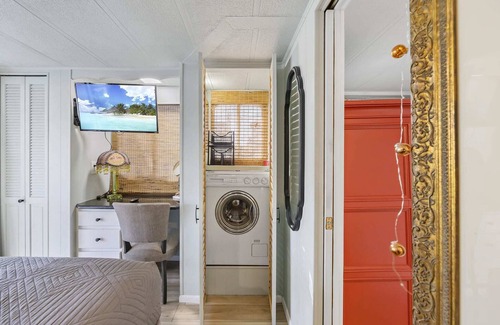 Venture a bit further inside the boat to discover a private bedroom adorned with a comfortable queen bed. Additionally, a makeup table or a second work area is available for your convenience. A small combo washer/dryer is tucked away in a closet, ensuring you have everything you need for a seamless stay, though we recommend small loads to avoid wrinkling. Alternatively, a iron and iron board are provided to keep your clothes looking fresh.