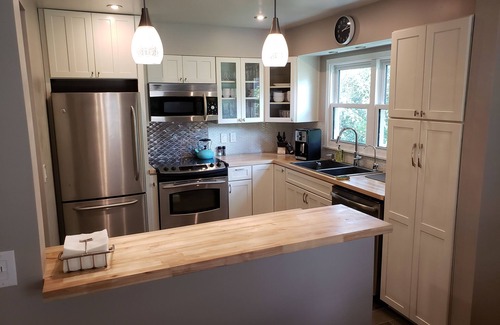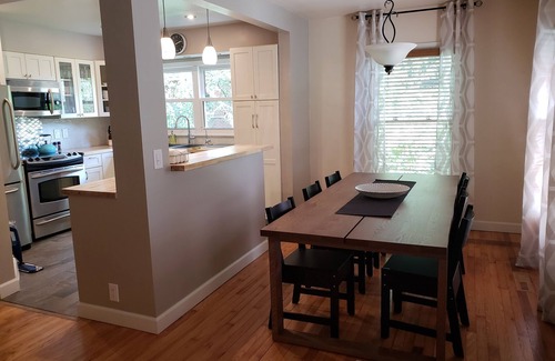 There are 5 bedrooms with queen beds and a sixth bedroom features adult bunk beds with full size mattresses. There are 3 full bathrooms. The main bath has a bathtub/shower combination. The master bathroom has a spa-like shower. The basement bathroom has a beautifully tiled shower as well. All beds have nice linens for a comfortable night of sleep. A large dining table allows all guests to gather for a meal. The kitchen is fully stocked with dishes for large groups and spices, oils, vinegars, flour, etc. are on hand in case you get an urge to whip up your favorite batch of cookies!