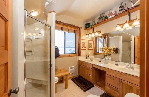 Behind the kitchen and dining area is the main-level bedroom with queen bed and ensuite bathroom. The bathroom has a single vanity and a full shower/bath combo. As you head upstairs you enter the second "loft" bedroom with a queen bed, laundry room, and attached bath. The large upstairs bathroom has a double vanity, walk-in shower, and views of the slopes.