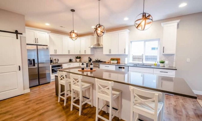 The kitchen is fully equipped with brand-new stainless-steel appliances, new cookware, plenty of cabinet space, and everything you need to serve meals, bake cookies and casseroles, or host a potluck dinner. There is a dishwasher, microwave oven, stainless steel sink with garbage disposal, full-sized stove with oven, refrigerator and freezer. Other appliances are also provided, such as Keurig coffee maker, toaster, rice cooker, electric kettle, electric wine opener, and slow cooker. Meal preparation just got better with our granite countertop island that can seat up 4 people.