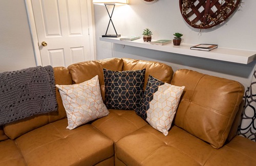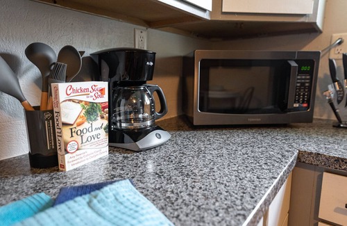 This two bedroom unit packs a punch! Both the queen bedroom and the king bedroom offer smart televisions, dressers and closet space. This adorable unit has an open concept kitchen and living room. The cozy living room has all the extras as well with a fireplace and a 55" smart television, leather sectional, and a desk for laptop usage. The eat in kitchen comes with the basic cooking essentials and place setting for four. Full size washer and dryer also available.
