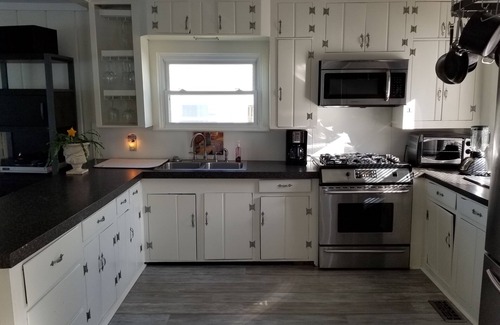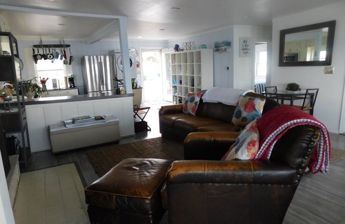 The cottage has 3 bedrooms, and 1.5 bathrooms. The cottage has a modern open floor plan with a living room, full kitchen and dining area. There is a large screen television and fireplace are located in the living room. Additional sleeping in the living room is available.