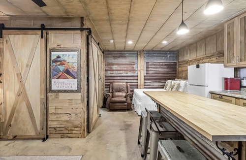 The interior cabin construction was distinctly built using reclaimed materials, as well as the outside patio and parking areas. Outdoor seating and a picnic area are available for a memorable night of conversing by the campfire as the stars come out. The 400 square-foot cabins each boast comfortable beds, soft linens, and a kitchen with a full-size refrigerator, stovetop oven range, microwave, and coffee maker. A floating island breakfast bar is a convenient place to relax and share a meal together. Indulge in a favorite movie on the TV provided.
