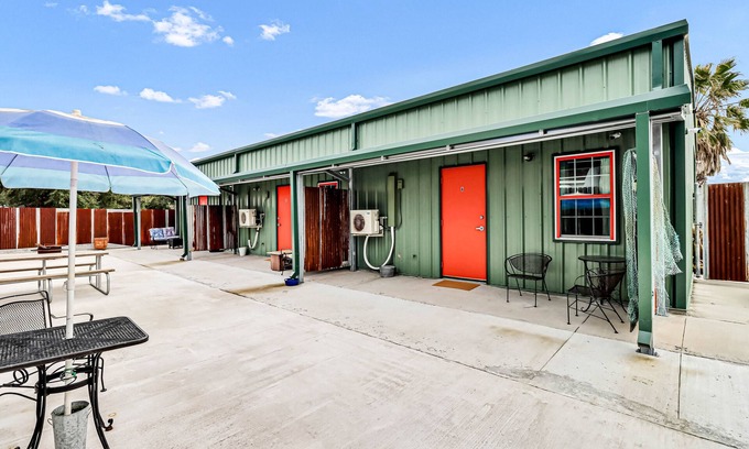 The Casas Coastal Experience cabins are uniquely designed in a South Texas rustic style with a Gulf Coast charm. Located within walking distance of Estes Cove, sunny fun awaits on the shores, at the shops and the eateries that surround it. The South Texas coast area is beautifully embellished with art-like windswept Texas Live oak trees where often Great Blue Herons can be found nesting. On this property, the cedar post fencing, along with reclaimed corrugated tin, and salvaged oil field pipe, represents the area.