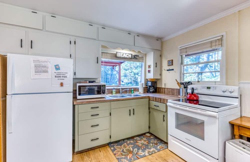 The living room opens into the kitchenette that features all the major appliances and cooking utensils (including Calphalon cookware) that you require to satisfy your culinary needs. A refrigerator, stovetop/oven, and microwave are at hand for mixing ingredients and preparing delicious cuisine. A coffee grinder and coffee maker are included for brewing delicious cups of your favorite morning beverage. A cute wooden dining table provides the perfect space to share meals and although there isn't a dishwasher, you can always let the mess soak while you enjoy a sunset from the back deck.