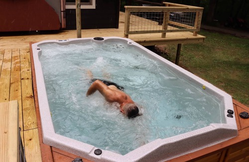 Outdoor heated swim spa (seats 8)on outdoor patio.