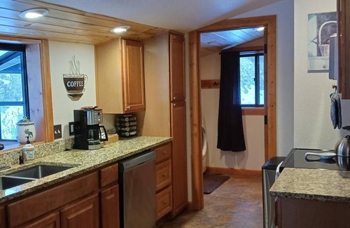 Quaint, cozy, and comfortable mountain cabin, nestled in the pines and aspens with Turkey Creek running through the property. Originally built in 1937 and recently updated with vaulted ceilings, granite countertops, stainless steel appliances, and charm in abundance! The cabin sleeps 4, with a queen-sized Aero-bed for occasional use. Curl up in front of the wood-burning fireplace that will keep you warm and comfy on those chilly evenings.