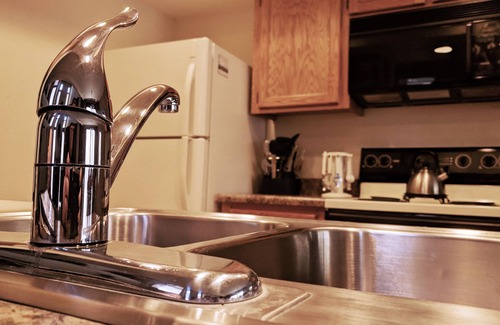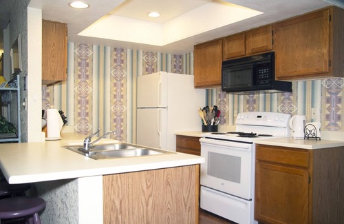 Spacious 2 bedroom 2 bath condo with wood burning fireplace. Fully stocked kitchen with full size refrigerator, range, microwave. Dining room with table that seats six, private deck with barbecue, private garage with remote, upstairs with full bathroom and twin beds, free high speed internet, flat screen tv's in bedrooms and living room (dvd player), beautiful landscaping with tall pines and stream and ponds.