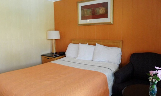This hotel room with 1 queen bed is located at Pinebrook motel Lake George.