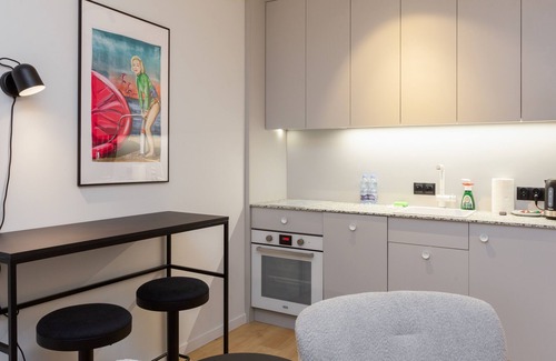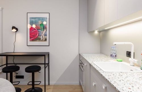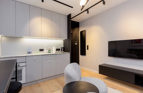 Quercus Deluxe Studio #B is a stylish and modernly furnished apartment, featuring a living room with a comfortable double bed and a kitchenette and a bathroom. It offers a range of top-notch amenities, including free WiFi, a TV, a washer-dryer, a hairdryer, an iron, a dishwasher, an oven, a fridge with a freezer, and kitchen accessories. Guests also have access to a parking space in the underground garage. The apartment features access to a shared balcony, which is not separated from the neighboring unit, making it a semi-private space ideal for a quiet morning coffee or an evening breeze.