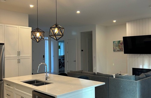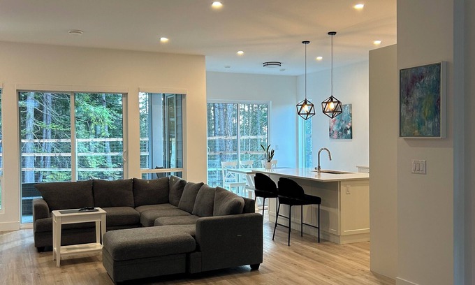 The open concept design connects the living, dining, and kitchen areas seamlessly, making the space ideal for entertaining and everyday living. Large sliding doors flood the interior with natural light, highlighting the clean, modern finishes throughout.