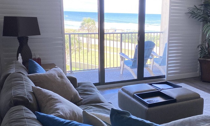 LIVING ROOM- Large sectional that is very comfy! Perfect for the family to stretch out on after a fun day at the beach. Relax while watching TV on a 50' HDTV or simply look out of the sliding door and take in the beautiful view of the ocean. There is also a balcony off of the living room with chairs and to really soak in your surroundings.