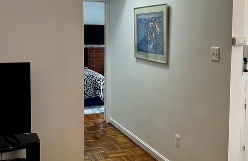Quiet, bright and newly renovated, this 750 sq ft one bedroom apartment can houses 2 people comfortably. It has large energy efficient double-paned windows throughout, a queen size sofa, a workspace with a simple ornate desk and desk chair, a large and deep double door closet in the living room and bedroom, a 2" topper queen bed, two light blue/grey swivel chairs, an original 1950's standard size bathroom with a tub and shower combo, a BRAND NEW kitchen with a gas stove/oven, refrigerator, a built-in microwave over the stove, a dishwasher, a dining room table with 4 chairs, original 1950's parquet wood floors with area rugs, a fireplace, a Sharp 50" Smart TV in the living room, a Toshiba 43" Smart TV in the bedroom, an AC/Heat Unit in the Living Room and Bedroom.