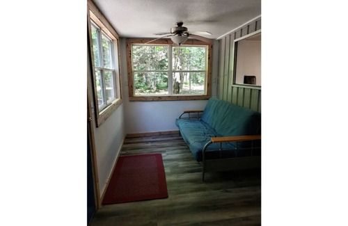 One bedroom with queen bed. The front room has a futon. Kitchen has basic utensils including toaster and coffee pot. Grill located outside as well.