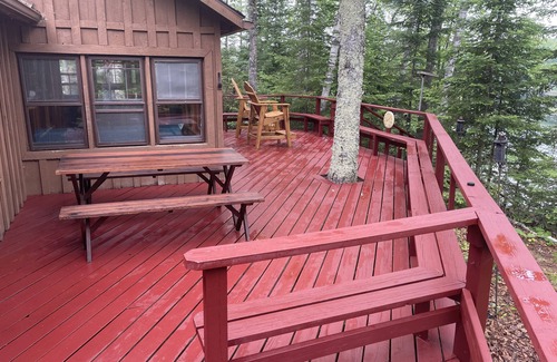 Nestled along a private road, Bearskull Cabin is perched on 3 acres of wooded hillside overlooking pristine, 80-acre Bearskull Lake. Enjoy 650' of secluded shoreline. From the spacious and private deck, take in sublime views of a small island (with nesting loons) and a wild, undeveloped far shore studded with big pines. Inside, Bearskull Cabin is a step back in time, paneled with original 1950s knotty pine but with updated fixtures and furniture. The lake is quiet, deep, and lovely: great for swimming, fishing and boating. We have three nice boats for guests to use: a rowboat, a kayak, and a canoe. Deck has a picnic table, Adirondack chairs, and a charcoal grill. One bedroom with a queen-sized bed, new carpet, and large dresser. The small bathroom includes a clawfoot tub with shower surround. The couch in the living room pulls out to a queen-sized bed. While secluded, Bearskull Cabin is within a few miles of several memorable Northwoods eateries, and many other lakes and natural areas.