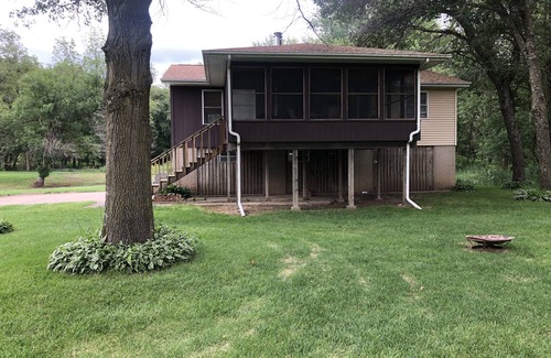 Cabin(1100sq. ft) has all the amenities of home but in a camping environment. Wapsipinicon river in the front yard for fishing and a 5 min walk to a private sandbar for relaxing. Firepit and grill provided. 20 min drive to Marion and 10-15 minutes to small town restaurants and shopping. No WIFI, internet or cable, just a TV with local channels. No hunting or discharging of firearms allowed.