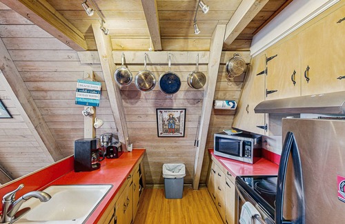 Enter this lovely A-frame cabin through the sliding glass doors and find yourself in the main living area. Large windows allow light to suffuse the space. Kick off your shoes and stretch out on the long leather couch while you recover from your travels; the flatscreen TV is equipped with Roku and Netflix in lieu of cable.