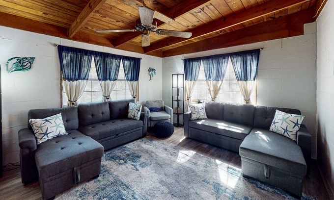 Discover low-key coastal living at this quiet Bear Point bungalow. Surrounded by local fishing charter options, this breezy retreat is located just five miles from shops, restaurants, and gulf-front attractions in Orange Beach. Furnished for no-frills comfort and convenience, the cottage features an updated, stainless steel kitchen and a large living area with twin sofas and a smart TV. Ceiling fans and mounted air-conditioners in the kitchen and bedroom circulate cool air throughout the space. Free WiFi rounds out the modern home essentials.