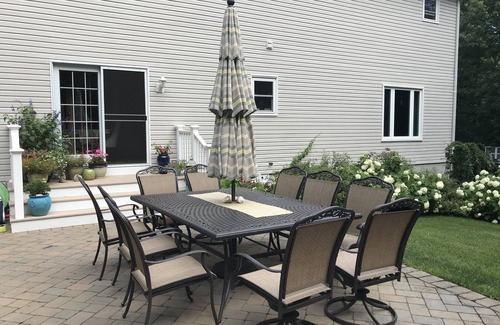 Lovely Spacious, 4BR, 3BA, Central AC, amenities galore for a relaxing getaway, featuring a Saltwater Pool with a Waterfall set on beautifully landscaped acre. EnJOY relaxing with a book by pool or front porch swing after a day at one of many beautiful beaches. You may like to workout in Exercise Studio, a walk by the Bay a mile away or take some free throws on basketball hoop. We are located 1 mile from Historic & Quaint Village of Sag Harbor with fabulous Restaurants, BayStreet Theater and lots of live music. Just 2 miles to Morton's Wildlife Refuse with beach access, 3 miles to Bridgehampton Classic Horse show, 2 miles to Long Beach Bay and just 5 miles to the Atlantic Ocean Beach with white soft sand. Located on Cul de Sac off of Noyac Rd. makes taking back roads easy and avoids Summer traffic.
