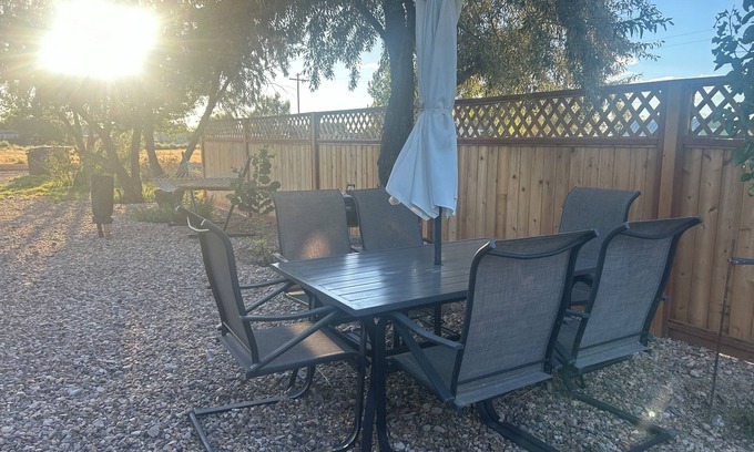 This charming glamper offers a queen bedroom, full bath with shower, and a cozy living room with fireplace and extra sleeping space (queen sofa bed + twin). Stay comfortable year-round with AC, heat, and WiFi, while still enjoying the magic of glamping. Outside, relax in your private yard with a hammock, fire table, and BBQ grill. Rainy day activities are included to help you truly unplug and retreat. Laundry service available. Perfect for extended stays or a quiet getaway with all the comforts of home. Water toys available at no extra cost.