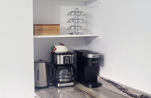 Coffee maker, kettle, kurig machine, toaster, fridge, stove.