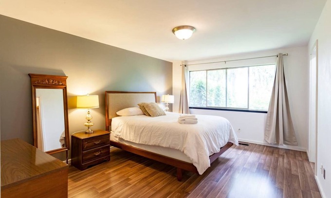 Big large windows allowing in tons of natural light and a view of lake, mountain, and lush greenery can be captured from your living room, master bedroom, kitchen & sundeck/patio ( with BBQ & Dining Table set for 4); tranquility at its best. Have a cup of tea, read a book, relax, and feel as though you're on a retreat during your stay.