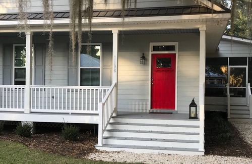 Our cottage is situated next door to a small park with live oaks cloaked in Spanish Moss. You will enjoy a beautiful view of the oak trees and this quiet green space from the screened porch. Great place for morning coffee or afternoon drinks. This porch includes a small dining table. Our home includes two bedrooms and two baths with a large common area and modern kitchen. Lots of room for seating around the counter or the dining room.