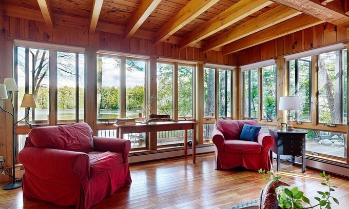Down-tree Cottage on Long Pond provides a quiet, tranquil, back-to-nature experience all year long. If you want to get away from it all, yet still be minutes away from the ski slopes, restaurants, shopping, hiking, kayaking and more, this is your place! Two entire sides of the living room has floor to ceiling windows that provide incredible views of nature, the lake, and the mountains. This is a very secluded, private little area tucked behind Pleasant Mountain.