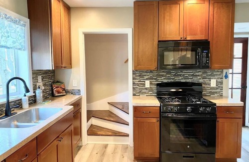 The home is an early 1900s bungalow. It has one bedroom downstairs (queen size bed) and two upstairs (king in the master bedroom and a bunk bed in the second bedroom). There is a full bathroom on the second floor with a Jacuzzi tub and a half bathroom on the first floor. The stairs to the second floor are a bit steep so use caution and there is a baby gate at the top of the stairs and one available at the bottom of the stairs for those with young children.