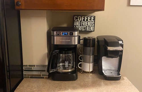 The kitchen has everything you need to make a meal from pots and pans to bakeware. We also provide coffee, tea, some spices, flour, and sugar. We even have an ice cream machine, blender, toaster, and more. We also have a gas grill outside, grilling tools, and roasting sticks for the fire pit.