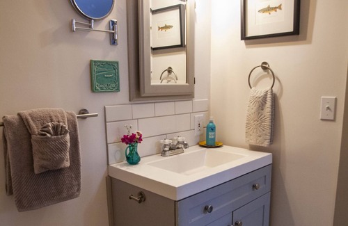 The contemporary-cottage designed space with local artworks and a mixture of furnishings forge a cheerful atmosphere within this artists studio guesthouse. Brew a cup of tea and make your breakfast or dinner in the full kitchen. Unwind on the quite private deck, or find a shady seat at the foot of the birch tree before starting or ending your day.