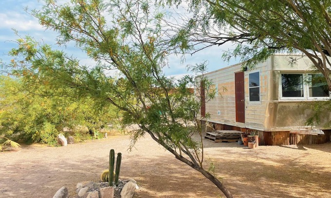 Each of the two accommodations is nestled in a vintage restored trailer, Las Sombras Suite 47 is an Airstream from 1947, and Las Sombras Suite 54 is a Mobiliner Hicks from 1954. At this time, you will have the entire property to yourself, as Las Sombras 47, the second trailer, is not being rented and awaits remodeling. Each trailer opens onto the shared courtyard and grounds, and each has its own outdoor kitchen, shaded dining area, private bathroom within the double bathhouse, and a private entrance to the property.