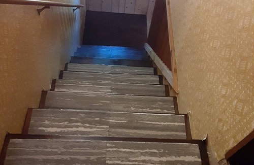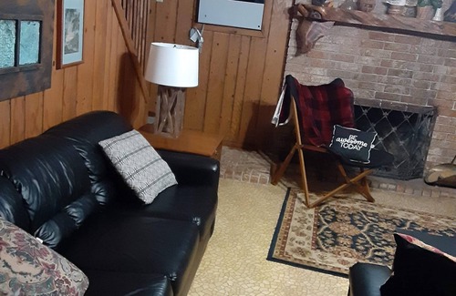 This is a rustic retro family vacation home from the 80s. It feels secluded among trees with a screened-in porch. The home with still some retro decor, but plenty of room in the open concept kitchen, dining, and living room with a big stone, cypress-mantled fireplace will provide all the essentials. Two bedrooms upstairs, one with 2 queens, the other with 2 doubles share a full bath. The larger bedroom downstairs has a king-size bed and the smaller one dowmstairs has a queen size bed. Also a full bath and laundry are downstairs.