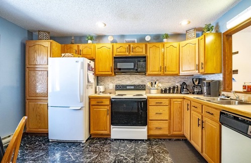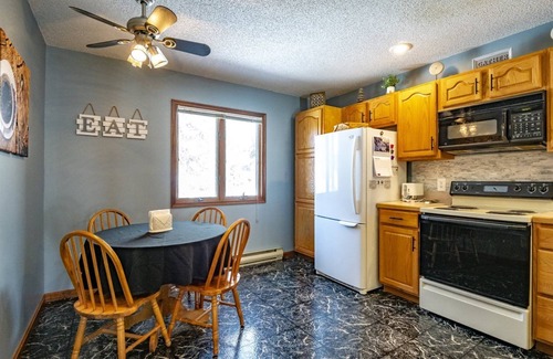 Inside, the home is warm and welcoming, with contemporary furnishings and a relaxed, inviting atmosphere. The open main level features a comfy living area with a wood-burning fireplace, a dining space for gathering, and a well-equipped kitchen that makes mealtimes easy and enjoyable. You’ll also find a convenient half bath and laundry area on this level, adding extra comfort to your stay.