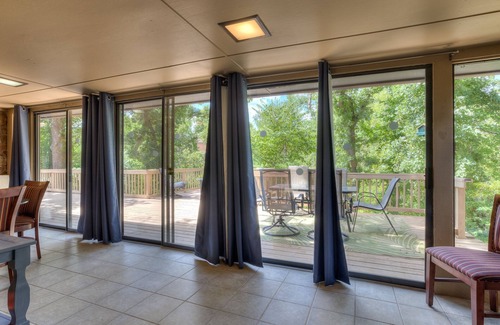 Surrounded by beautiful tall trees, this hideaway, is quiet with a secluded feel, as though hidden in the forest, while being in the middle of Edmond, just a mile from great restaurants, 2 very nice shopping areas, also places like Lowes, Walmart, Starbucks, Home Depot, etc. OCU and medical center just 2 miles away and easy access to I-35 and downtown OKC, as well as 3 miles from charming downtown old Edmond. A 2 car garage available for parking, and keyless entry to home The large deck has 2 tables for eating outside, along with a BBQ and a gas Firepit as well as a closed in sunroom with a table for cards and games and extra lounge deck chairs. You choose, whether running aound enjoying the sights and sounds of Edmond, or relaxing in a quiet retreat! We look forward to serving you.