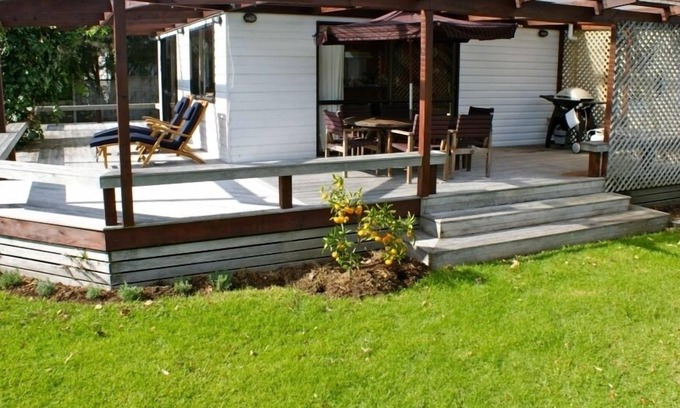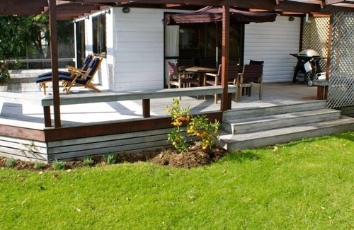 The living and dining area are spacious with a stereo, large TV for the sports fans and DVD player for the children. The lounge opens onto a large side and front deck, and a big grass yard. This house comes with deck chairs and loungers and a Webber BBQ.